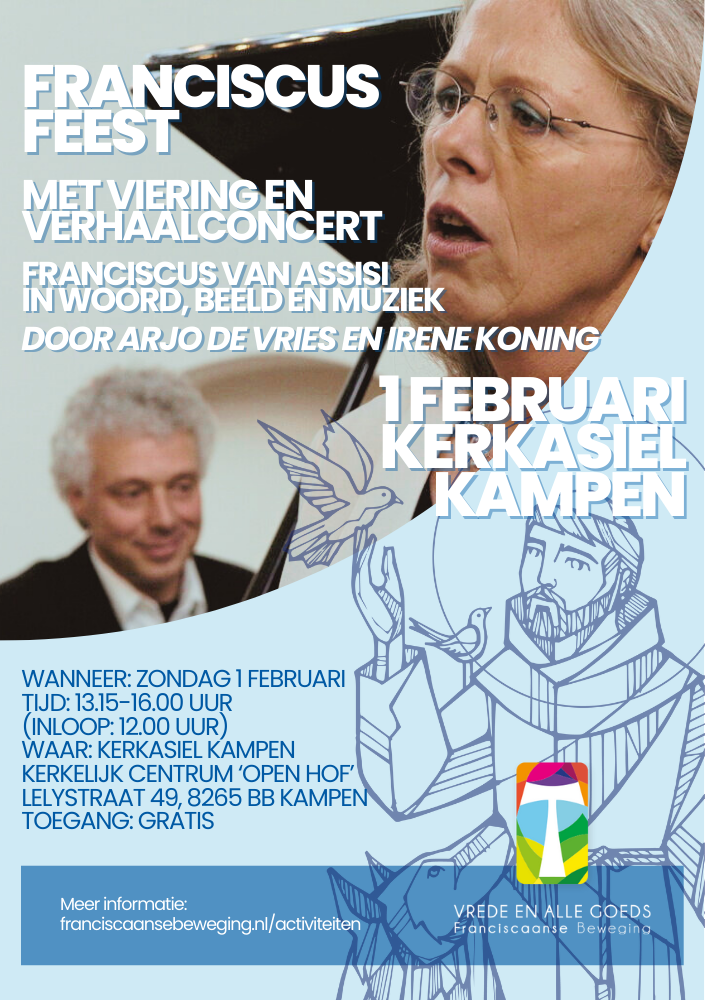 Op 1 februari wordt zo’n inzetmoment ingevuld met een Franciscusfeest en viering. Centraal tijdens de viering staat het verhaalconcert van Irene Koning en Arjo de Vries over het leven van Franciscus van Assisi.