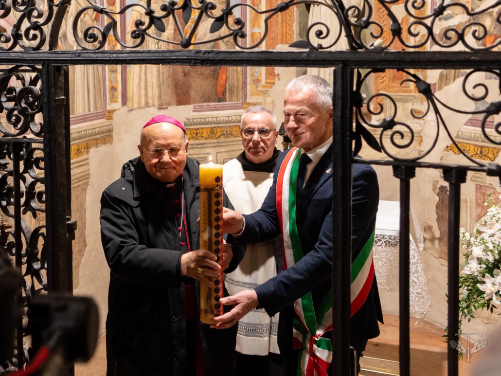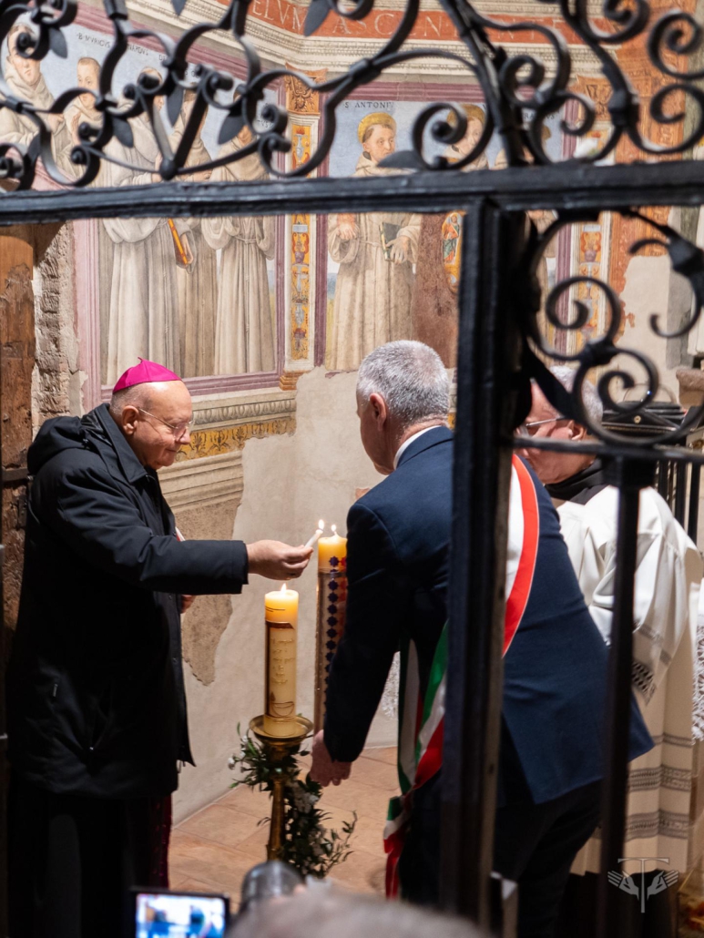 Dit jubeljaar is met veel luister geopend in de Santa Maria degli Angeli Basiliek in Assisi, gebouwd over het kleine Portiuncula kerkje van Franciscus en over de plek waar hij stierf. Als herinnering aan de vrede die Franciscus had gesticht tussen de Podestà, een middeleeuwse burgemeester, en bisschop Guido van Assisi werd de viering ingezet door de bisschop van Assisi-Nocera Umbra-Gualdo Tadino en Foligno, monseigneur Domenico Sorrentino, en de burgemeester van de stad Assisi, Valter Stoppini, die de basiliek met een niet-brandende kaars betraden. De kaars werd aangestoken in het kapelletje van de Transitus, de plaats waar Franciscus stief als teken van hoop op vrede. Dit licht werd daarna naar zes plaatsen in de basiliek die elk toevertrouwd waren aan verschillende ordes en groeperingen binnen de franciscaanse familie en gewijd aan een thema uit het testament van Franciscus. Om de eenheid van de franciscaanse familie te benadrukken namen de verschillende hoofden van de franciscaanse ordes, broeder Massimo Fusarelli ofm, broeder Carlos Alberto Trovarelli ofm.conv, broeder Roberto Genuin ofm.cap, Tibor Kauser ofs, broeder Amando Trujillo Cano tor en zuster Daisy Kalamparamban, voorzitster van de internationale franciscaanse conferentie van de broeders en zusters van de Reguliere Derde Orde aan de viering deel.
