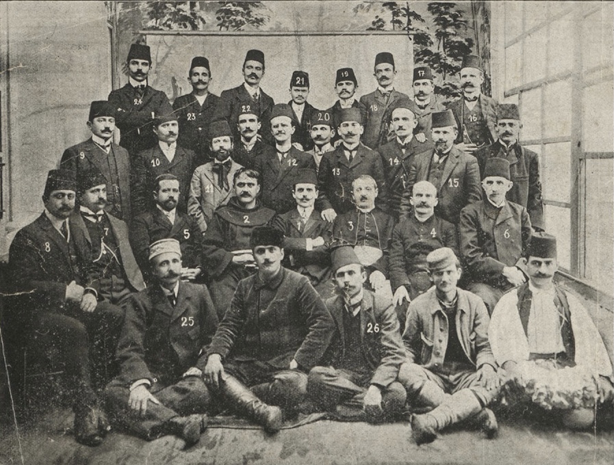 De ‘Vereniging voor de eenheid van de Albanese taal’. Broeder Fishta is de persoon in franciscaanse pij, links op de foto.