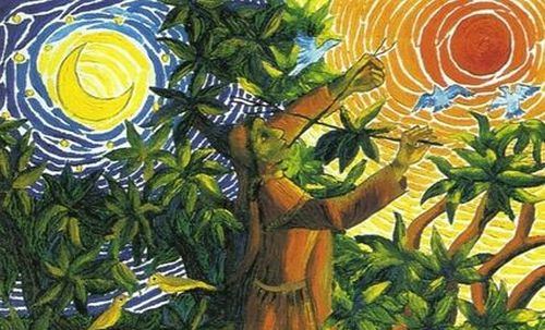 Lucy D’Souza (°1949) werd in Goa geboren en christelijk opgevoed te midden van hindoe- en moslimfamilies. Ze schildert met een helder kleurenpalet en wekt figuren dynamisch tot leven. De natuur en Bijbelse verhalen inspireren haar, alsook het Zonnelied van Franciscus.